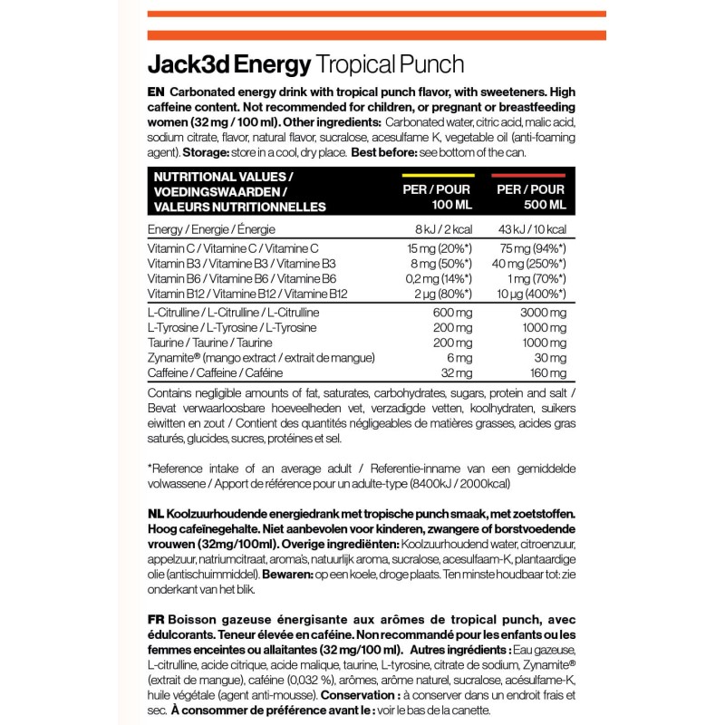 La plupart des boissons énergisantes jouent surtout sur la caféine et le goût. Jack3d Energy va plus loin : on est sur une logique “pré-workout RTD” avec une base pensée pour l’intensité. Tu as une combinaison d’actifs connus des sportifs (citrulline, tyrosine, taurine) + Zynamite®, pour une sensation plus “sport” que “soda énergisant”.