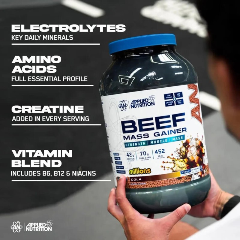 Beef Mass Gainer Applied Nutrition est un hard gainer nouvelle génération, pensé pour prendre du poids et du muscle sans tomber dans les gainers trop sucrés, trop lourds, ou écœurants. Chaque portion de 125 g apporte 452 kcal, 42 g d’isolat de protéine de bœuf, 70 g de glucides multi-sources, 3 g de créatine, et seulement 0,6 g de sucres, pour construire, pousser et récupérer sans exploser le compteur de sucre. Sa différence, c’est aussi la couche “performance + digestion” : acides aminés ajoutés, électrolytes, vitamines et minéraux, DigeZyme®, Probiwin™ et AstraGin® pour une assimilation plus confortable au quotidien. Un gainer puissant, facile à shaker, avec un goût moderne et une formule plus clean, sans lactose, sans gluten, et sans soja.
