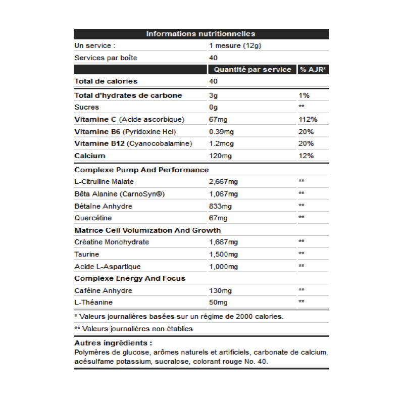 Beta-alanine (CarnoSyn®), Taurine, L-Citrulline, Créatine monohydrate, Caféine anhydre, Choline (Phosphorylcholine bitartrate, AlphaSize® alpha-glycérol, Cognizin® Citicoline), L-Théanine, Extrait de cacao (Theobroma cacao, graines), Extrait de galanga (tige et racine), Acide ascorbique (Vitamine C), Chlorhydrate de pyridoxine (Vitamine B6), Cyanocobalamine (Vitamine B12).