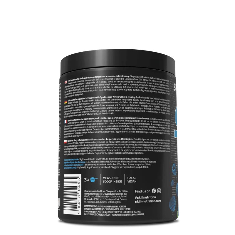 Skill PreWorkout Premium - 400g - Skill Nutrition propose une formulation propre de qualité premium vous t'amener à performer au maximum sans avoir d'effets secondaire en post-entrainement comme les crash avec les preworkout illégaux dangereux pour ta santé à moyen et long terme. Sa contenance avec de la caféine à effet prolongée   en marque déposée Xternergy™annihile les effets de pertes d'énergie très rapide et permet de performer longtemps ou sur une haute intensité de 45mn d'entrainement de musculation. La Théanine sous la ™marque déposée TheaGreen™ va venir se greffer à l'effet dela caféine comme un anti-stress permettant une énergie durable sans palpitation cardiaque. La théanine est un régulateur du système nerveux. La vitacholine va amener à un état d'alerte et de concentration accrue. La contenance en Astringin™ du booster Skill nutrition amène à une meilleure métabolisation des autres ingrédients dans la formule de cette poudre énergisante.