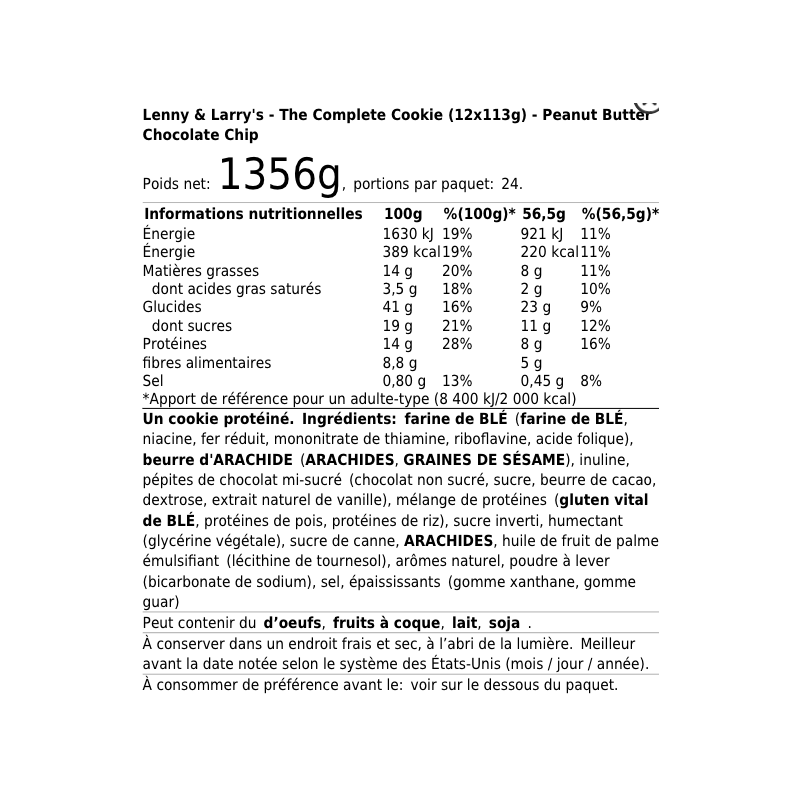 5. #Précaution#A consommer sous 48h après ouverture. A conserver à l'abris de l'humidité et de la chaleur. The complete Cookies Lenny & Larry's est un complément alimentaire.